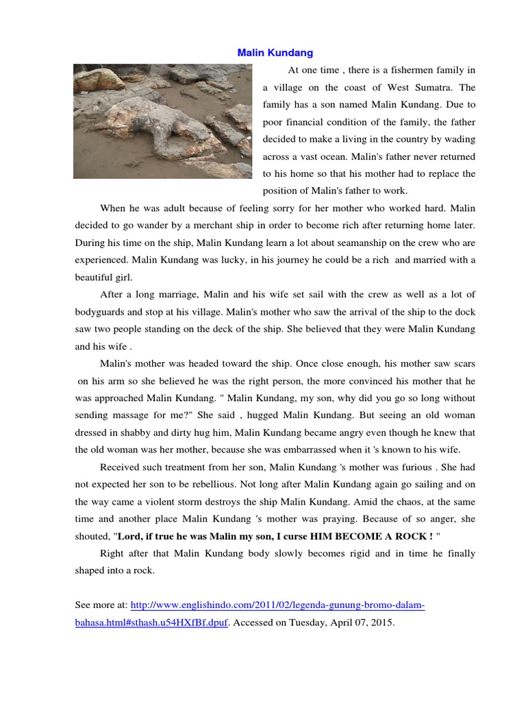 After several years waiting without any news, malin kundang's mother was suddenly surprised by the arrival of a big ship in the pier where she usually stood to wait for her son. The following title is the example of narrative text. The legend of malin kundang. Malin kundang dalam bahasa inggris. Selain itu, tim kami yang menyusun rangkuman materi bahasa inggris ini juga merupakan tim ahli yang lulusan jurusan bahasa inggris di salah satu kampus negeri di yogyakarta dan sudah berpengalaman mengajar bahasa materi bahasa inggris kelas 10 bab 13 malin kundang.